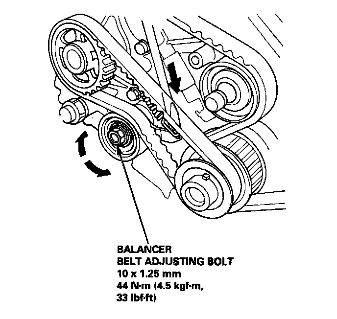16. Loosen and retighten the balancer belt adjusting bolt to tension the balancer belt.