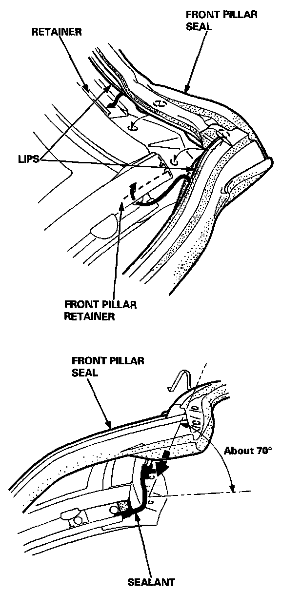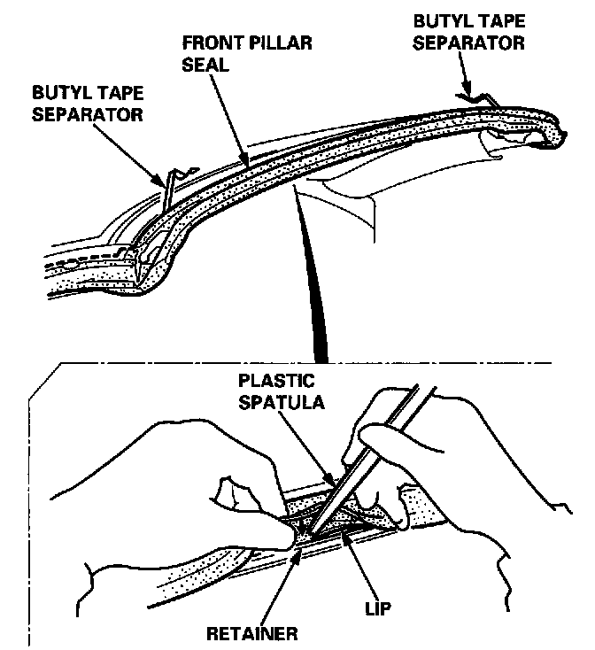 NOTE: To remove sealant from a painted surface or the front pillar seal, wipe with a soft shop towel dampened with alcohol.