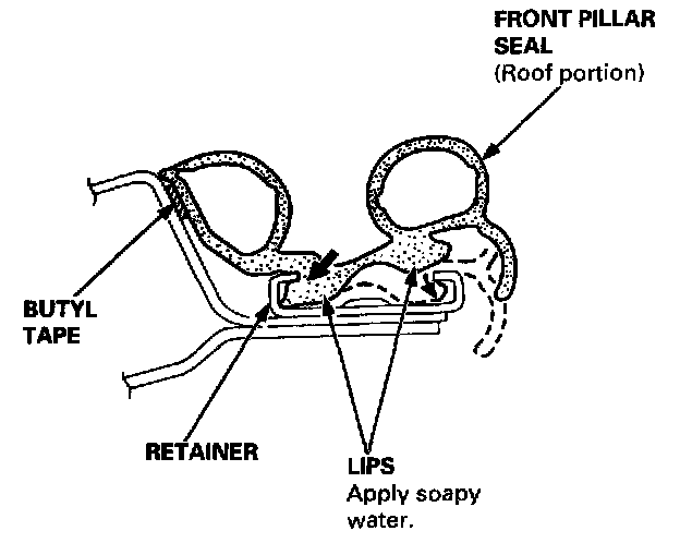 - Before installing the roof portion of the front pillar seal, lubricate the lips with soapy water.