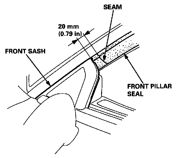 21. Close the doors, then check that there is about 20 mm (0.79 in.) between the top edge of the front sash and the seam on the front pillar seal on each side. Adjust the seal as needed, then press on the front pillar portion of the butyl tape to make the adhesive stick.