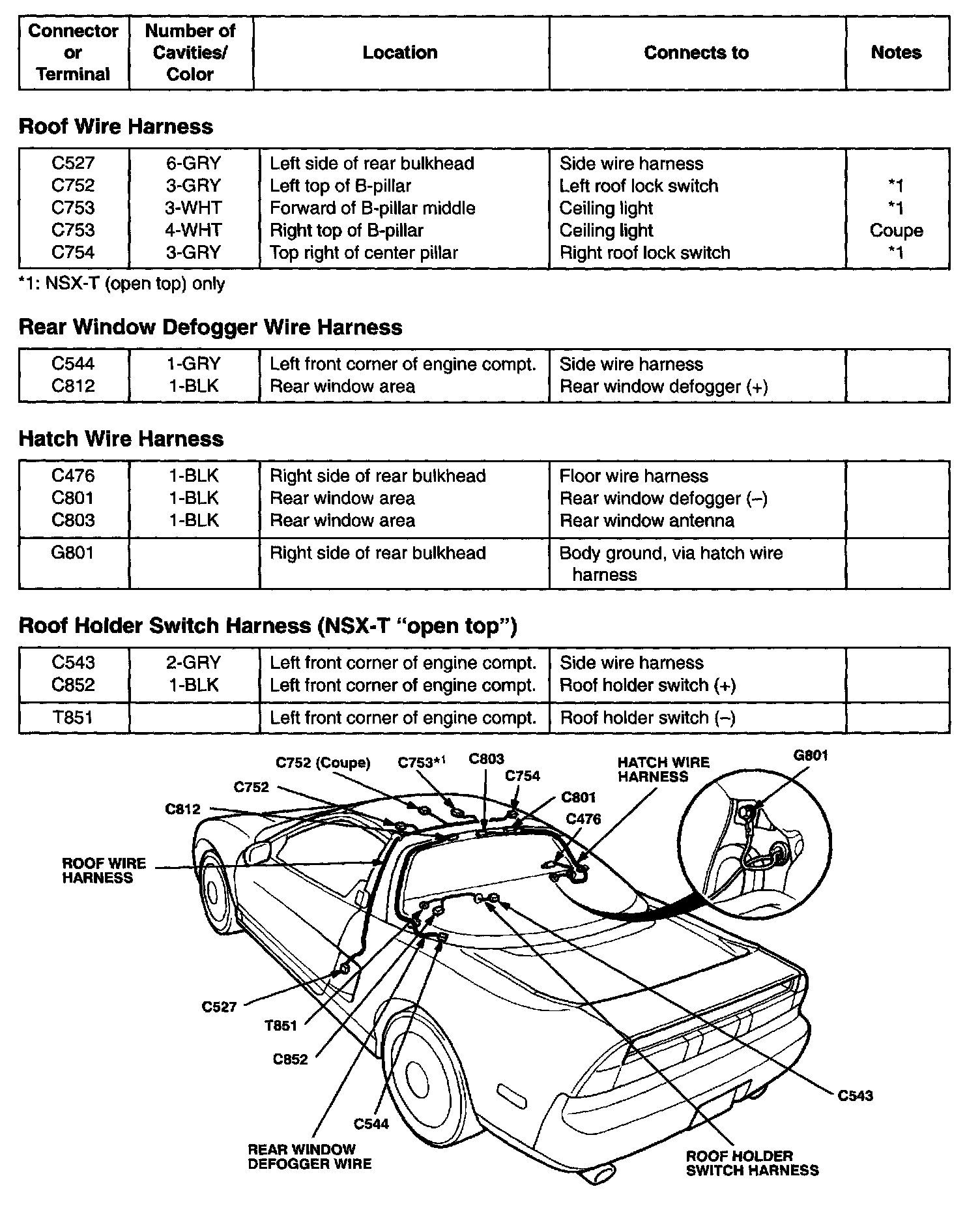 Roof Wire Harness/Rear Window Defogger Wire Harness/Hatch Wire Harness/Roof Holder Switch Harness (NSX-T "open Top"):