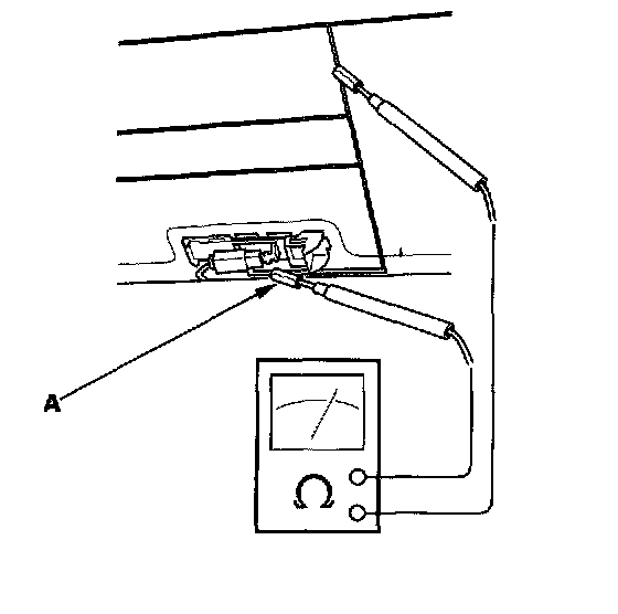2. Touch one tester probe to the window antenna terminal near (A), and move the other tester probe along the antenna wires to check that continuity exists.