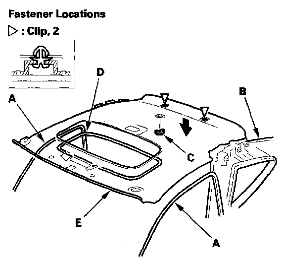 5. With the help of an assistant, detach the rear clips by pulling the rear portion of the headliner (E) down.