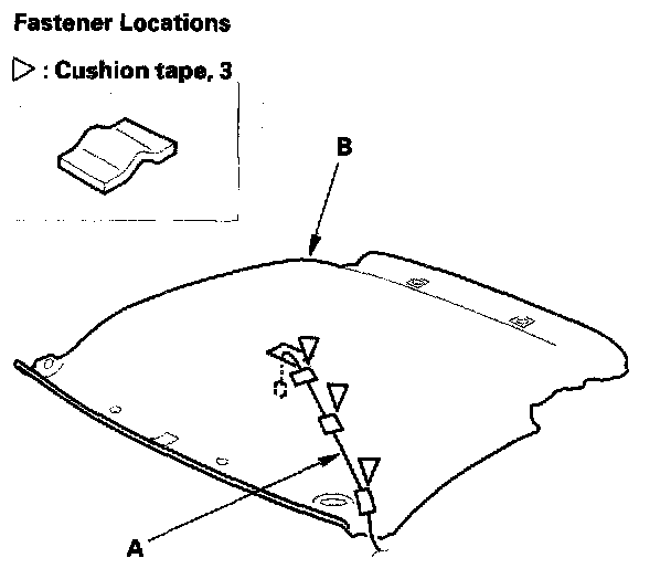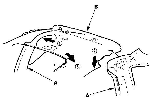 6. With the help of an assistant, hold the tops of the quarter pillar trim pieces (A) away from the roof, and work the headliner (B) free in the sequence shown.