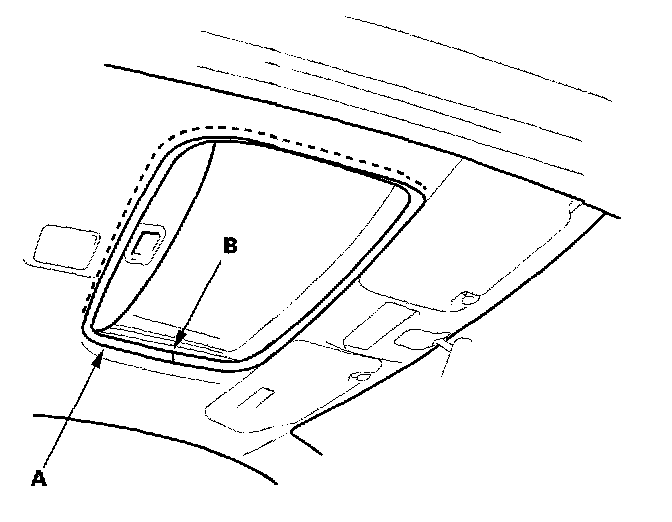 - With moonroof: When reinstalling the roof trim (A), install the joint (B) as shown.