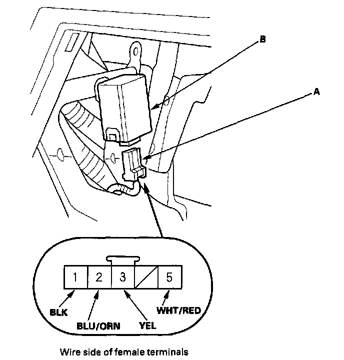 2. Disconnect the 5P connector (A) from the keyless receiver unit (B).