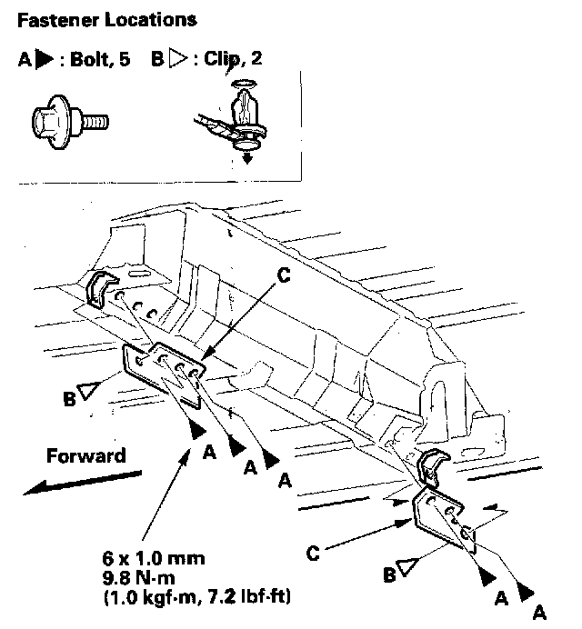1. Remove the bolts (A) and clips (B), then remove the rear strake (C) on each side. Take care not to scratch the body.