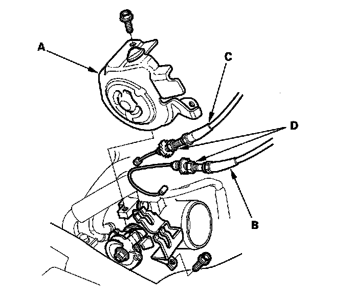 3. Remove the throttle cover (A). Fully open the throttle link and cruise control link by hand, then remove the throttle cable (B) and cruise control cable (C) from the links. Loosen the locknuts (D), and remove the cables from the bracket.