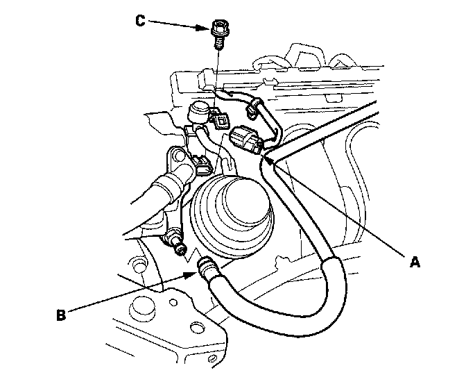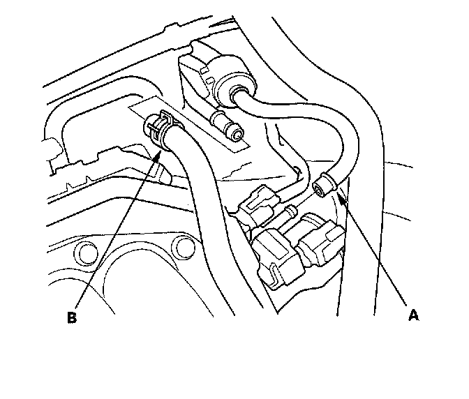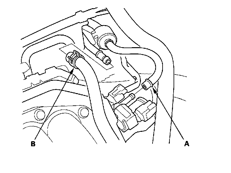7. Install the EVAP canister hose (A) and brake booster vacuum hose (B).