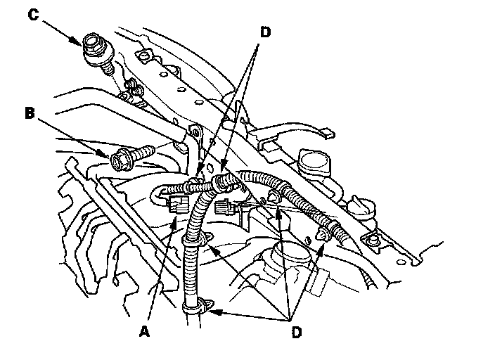 8. Disconnect the hood switch connector (A), then remove the Air Conditioning (A/C) line bracket mounting bolt (B), intake air duct mounting bolt (C) and harness clamps (D).