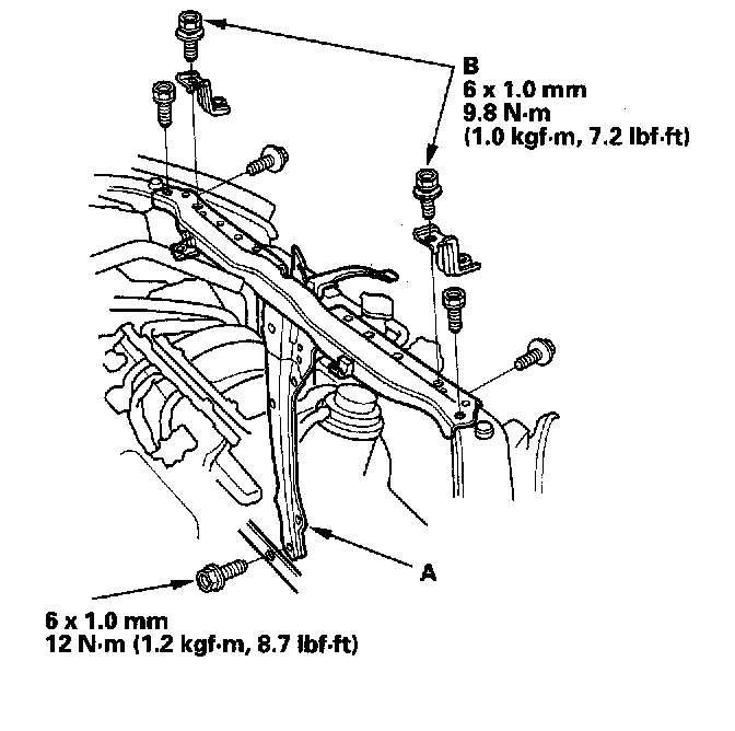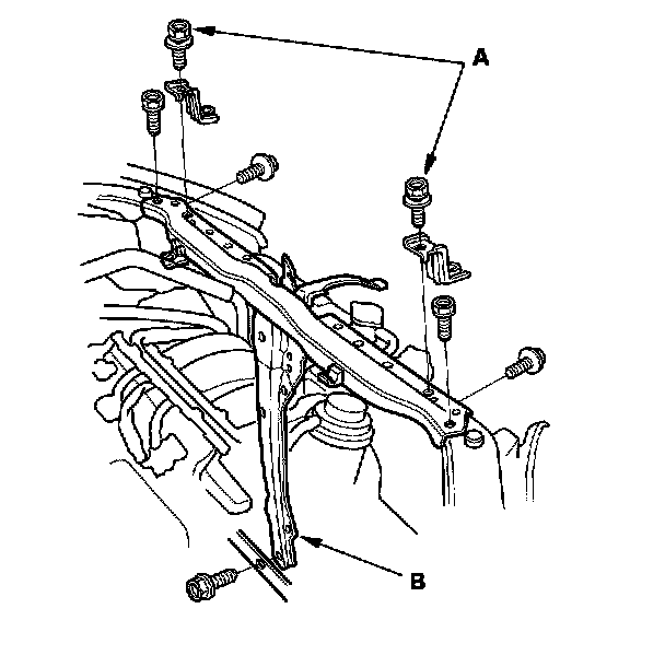 9. Remove the upper bracket and cushion mounting bolts (A), then remove the bulkhead (B).