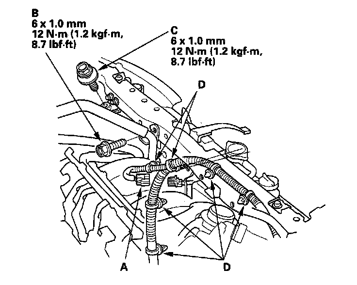 3. Connect the hood switch connector (A), then install the A/C line bracket mounting bolt (B), intake airduct mounting bolt (C) and harness clamps (D).