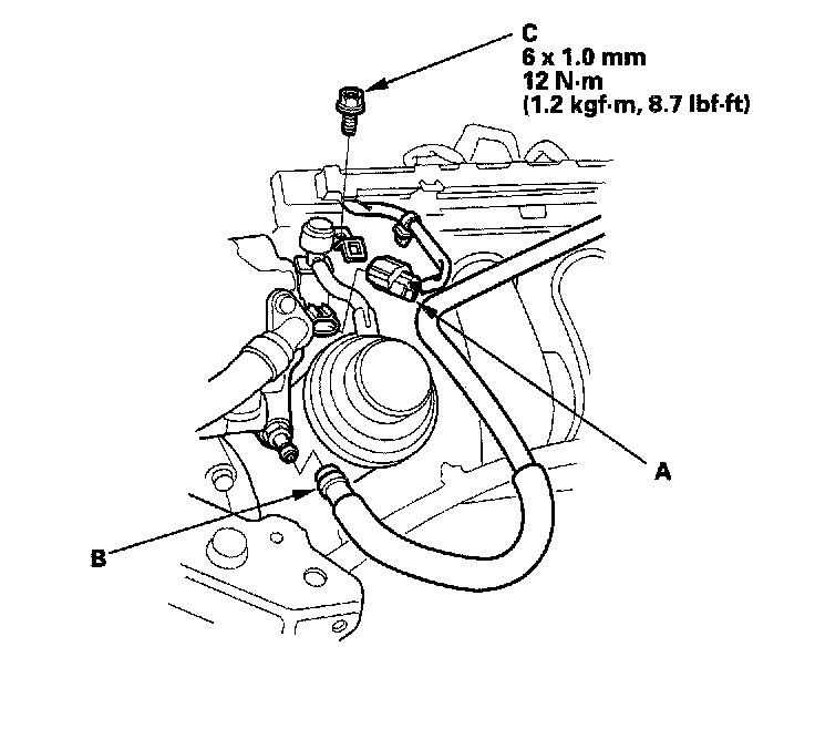 6. Disconnect the Intake Manifold Runner Control (IMRC) valve actuator control solenoid valve connector (A), then remove the Positive Crankcase Ventilation (PCV) hose (B) and IMRC valve control solenoid valve mounting bolt (C).
