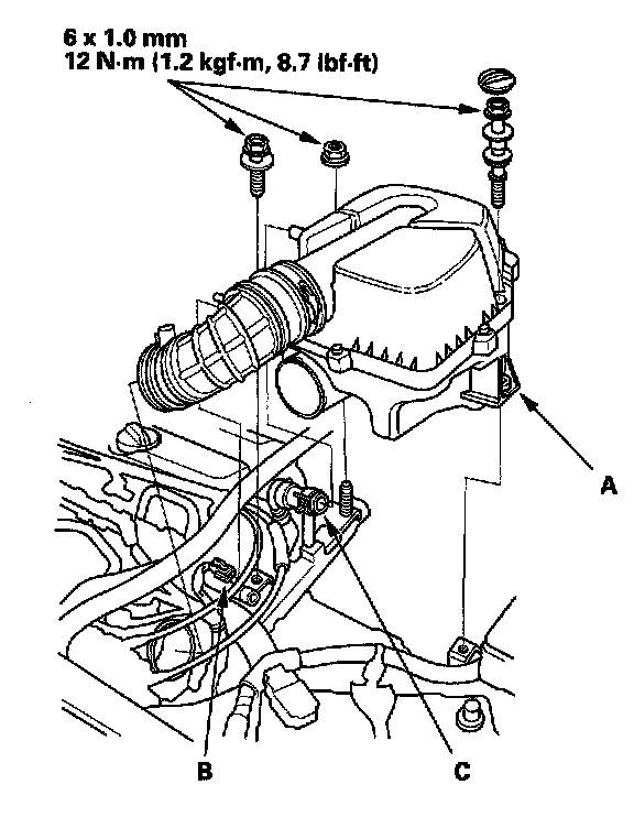 2. Disconnect the Intake Air Temperature (IAT) sensor connector (A), and remove the breather hose (B), then remove the air cleaner housing (C).