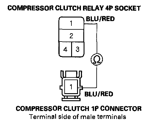 16. Check for continuity between the No.1 terminal of the compressor clutch relay 4P socket and the No.1 terminal of the compressor clutch 1P connector.