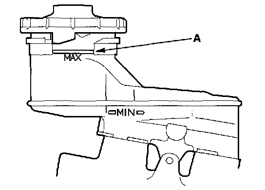 1. Make sure the brake fluid level in the reservoir is at the MAX (upper) level line (A).