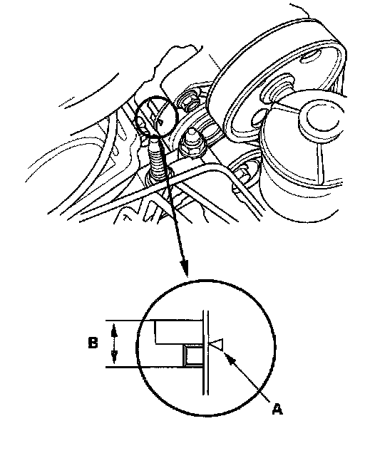 Check that the auto-tensioner indicator (A) is within the standard range (B) as shown. If it is out of the standard range, replace the
