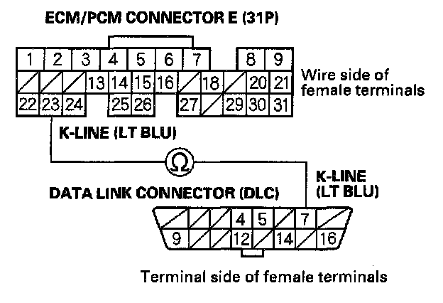 NO - Repair open in the wire between DLC terminal No.7 and the ECM/PCM (E23). After repairing the wire, check the DTC with the OBD II scan tool/Honda PGM Tester and go to the DTC Troubleshooting index.