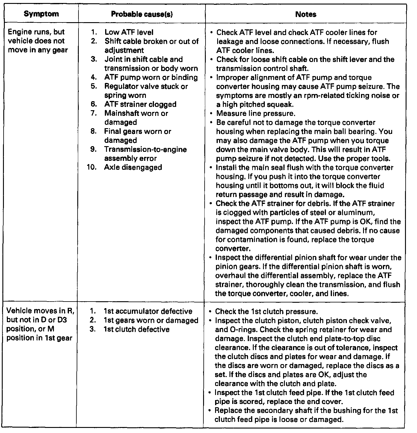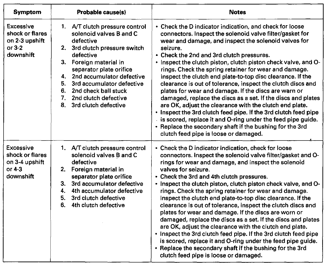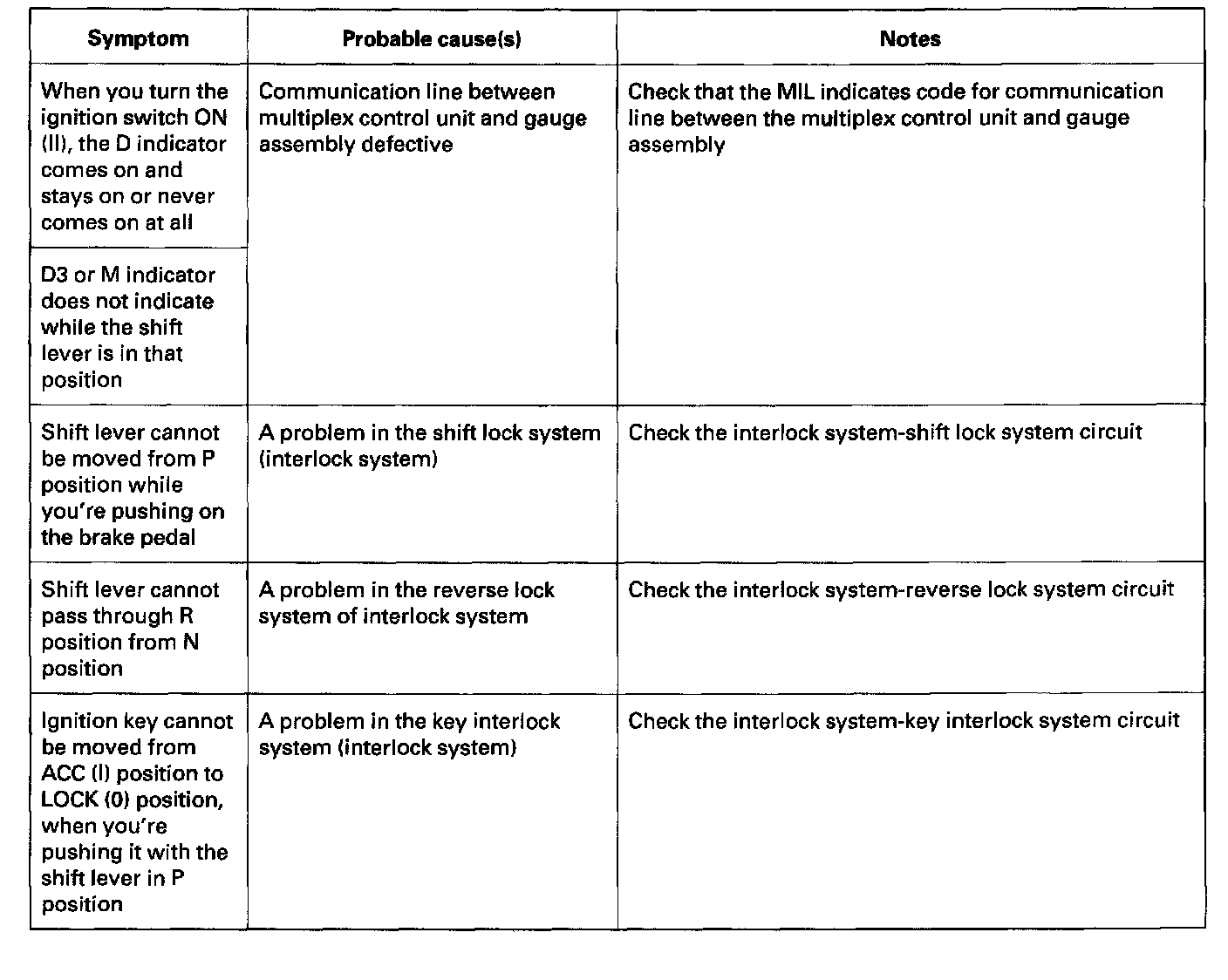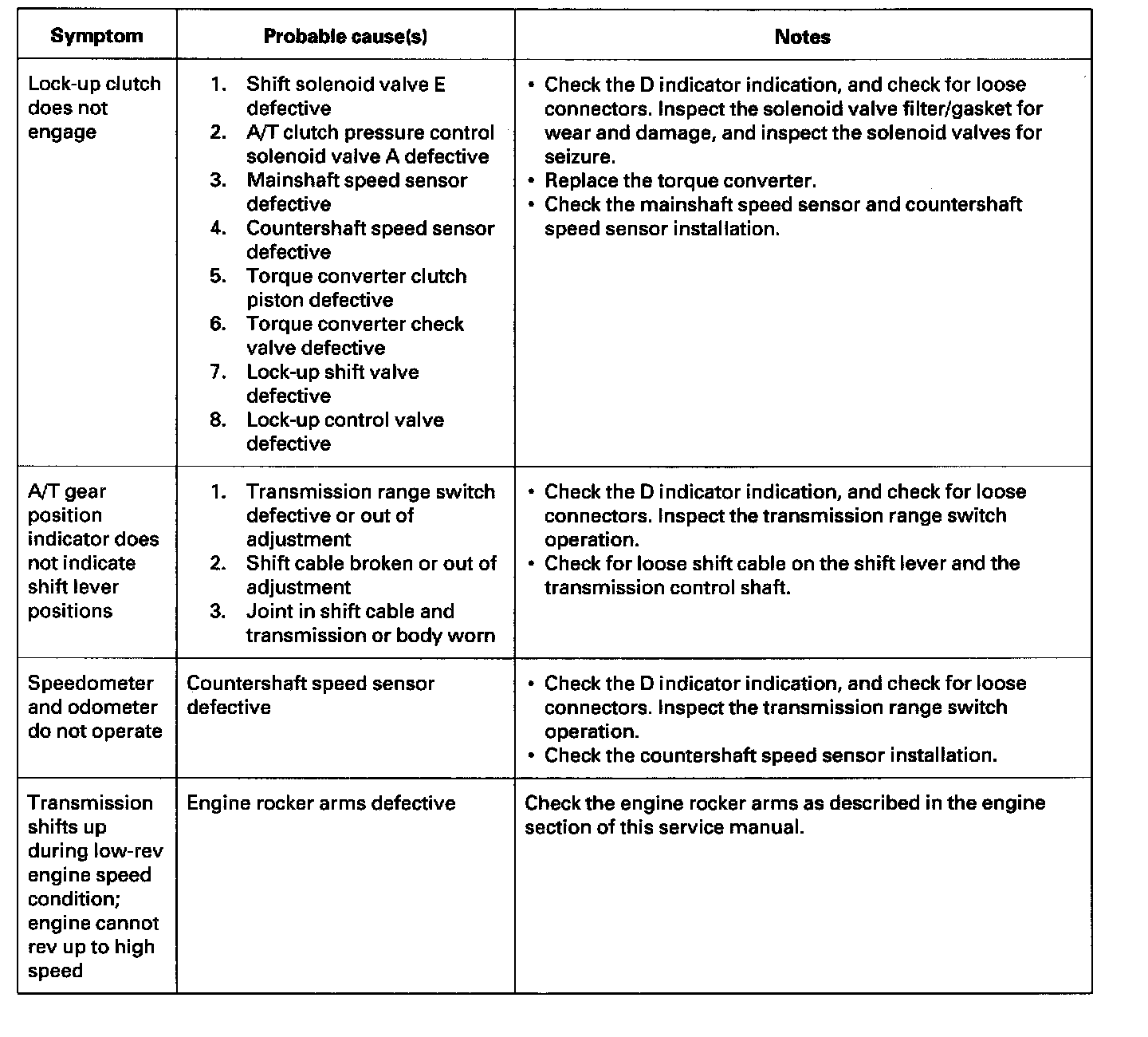 Symptom Troubleshooting IndexThese symptoms DO NOT trigger Diagnostic Trouble Codes (DTCs) or cause the D indicator to blink. If the Malfunction Indicator Lamp (MIL) was reported ON or the D indicator has been blinking, check for DTCs. But if the vehicle has one of the systems in the following chart, check the probable cause (s) for it, in the sequence listed, until you find the problem.