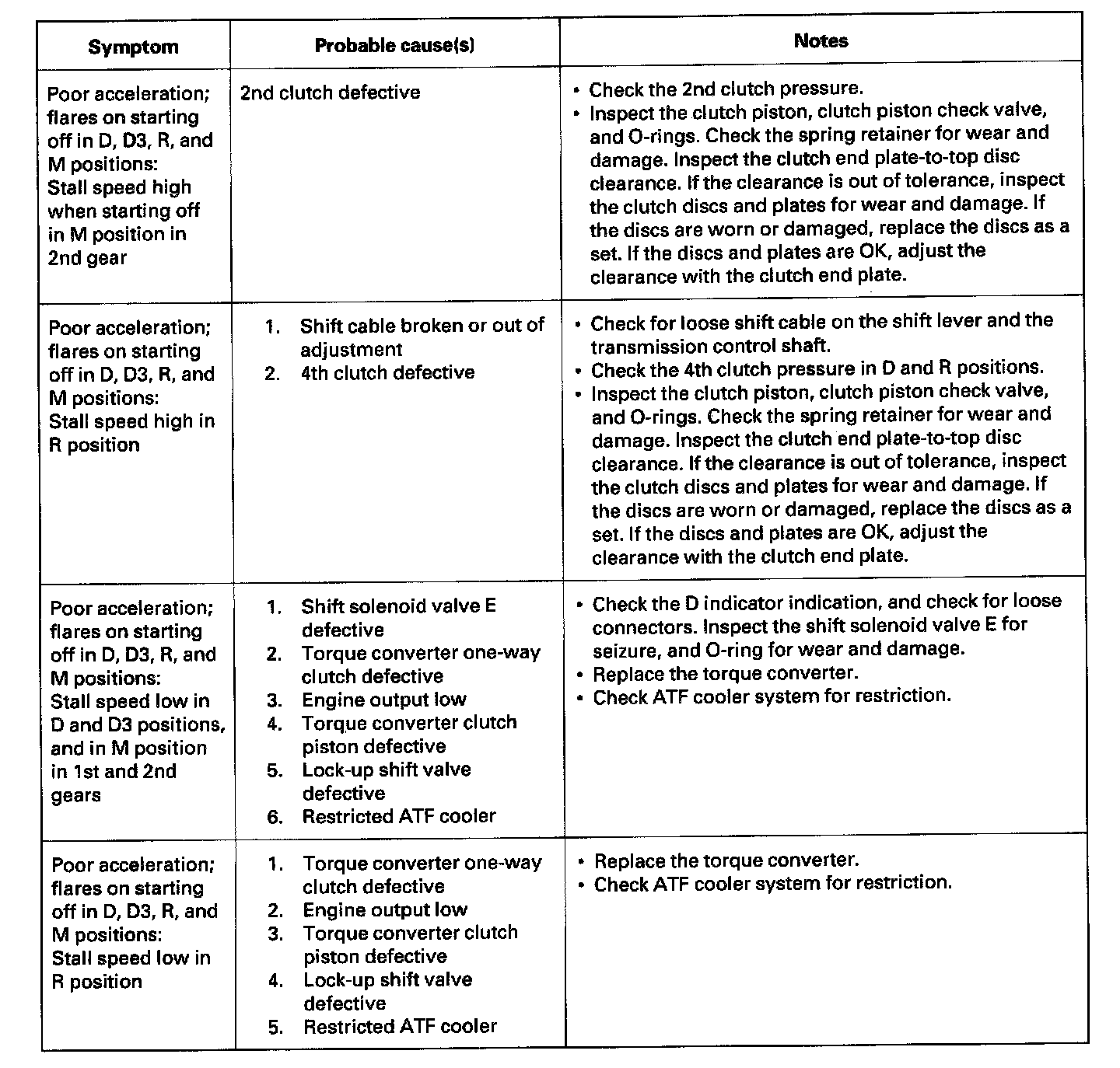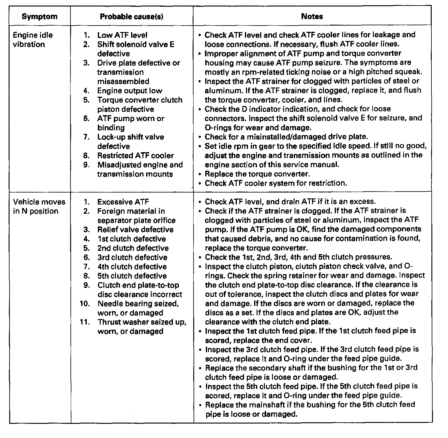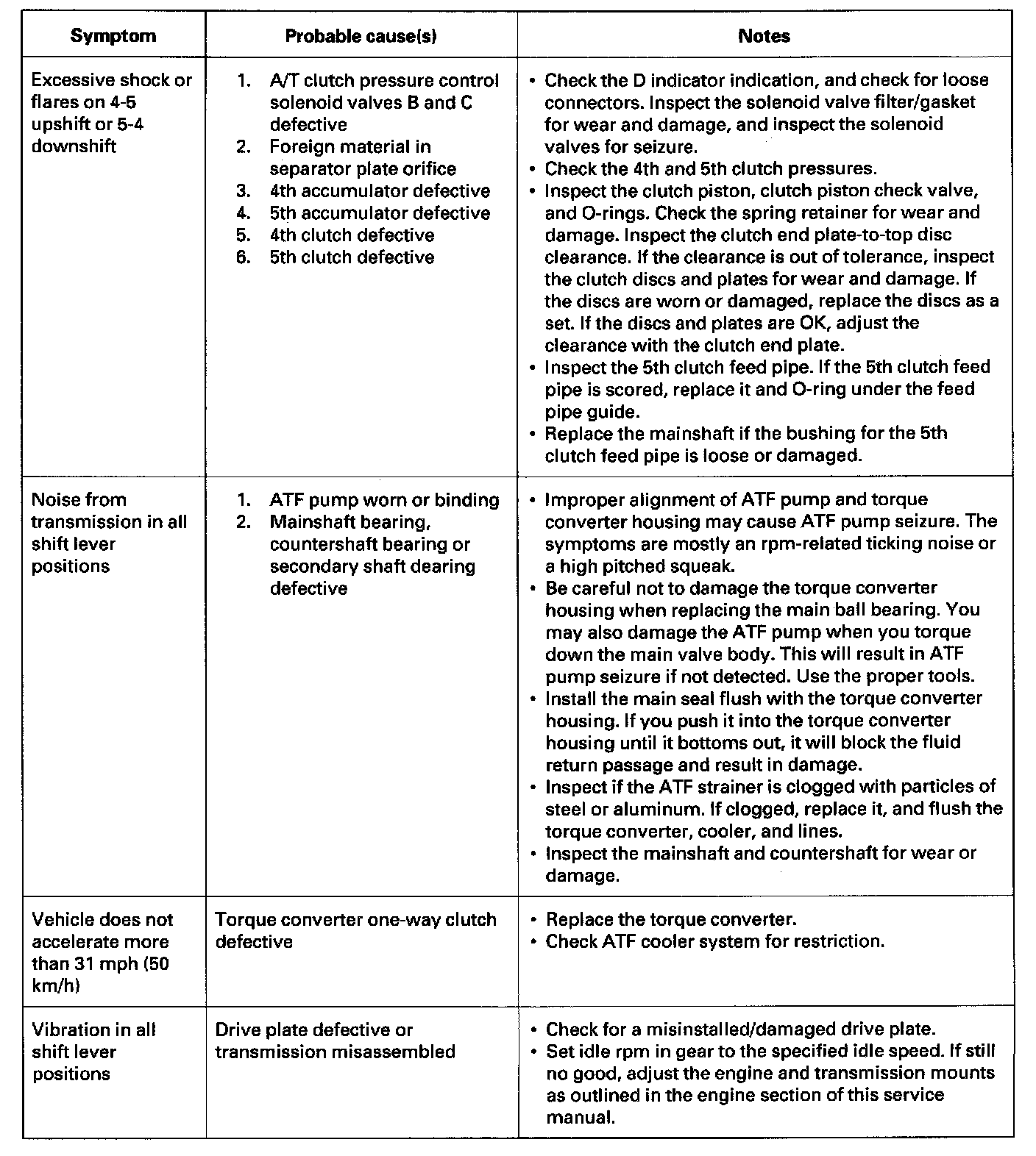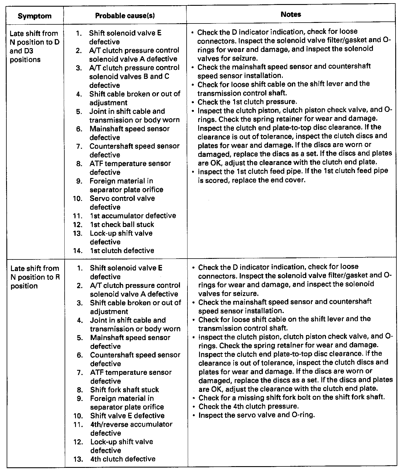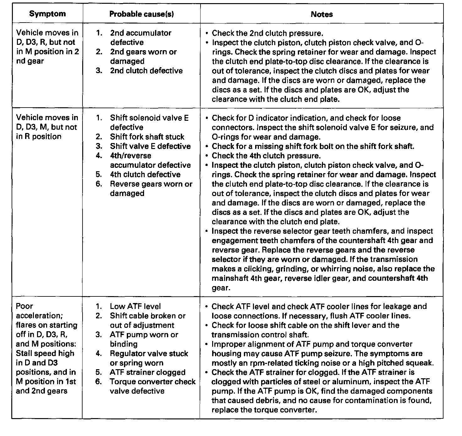 Symptom Troubleshooting IndexThese symptoms DO NOT trigger Diagnostic Trouble Codes (DTCs) or cause the D indicator to blink. If the Malfunction Indicator Lamp (MIL) was reported ON or the D indicator has been blinking, check for DTCs. But if the vehicle has one of the systems in the following chart, check the probable cause (s) for it, in the sequence listed, until you find the problem.