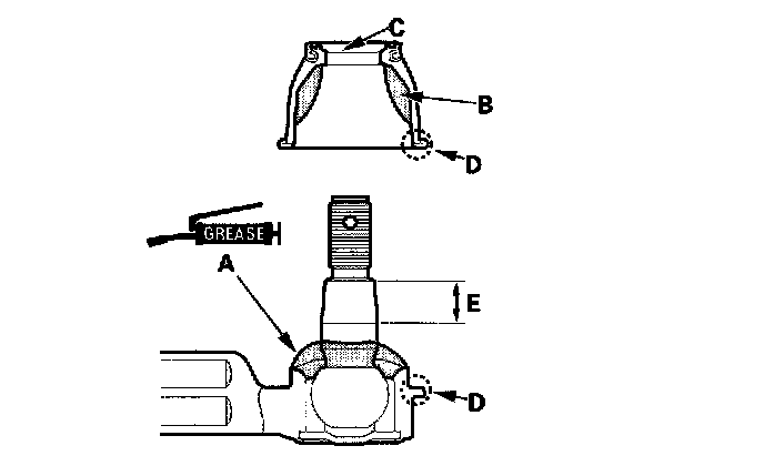 ^ Keep grease off the boot mounting area (D) and the tapered section (E) of the ball pin.