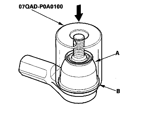 4. Install the new boot (A) using the special tool. The boot must not have a gap at the boot installation sections (B). After installing the boot, check the ball pin tapered section for grease contamination, and wipe it if necessary.