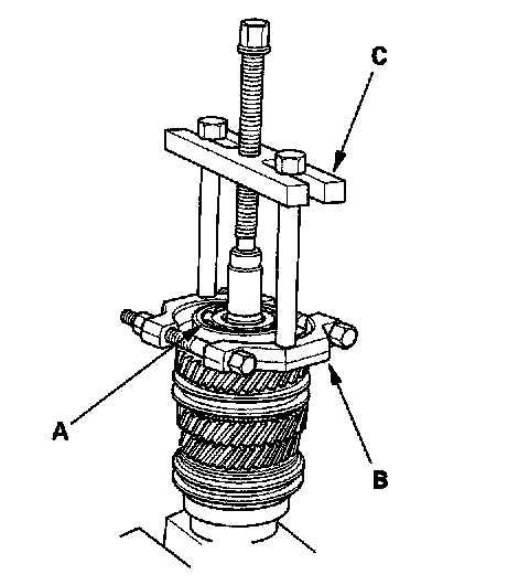 1. Remove the angular ball bearing (A) and the tapered cone ring using a commercially available bearing separator (B) and a commercially available bearing puller (C). Be sure the bearing separator is under the tapered cone ring. (5-speed model).