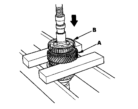 2. Support 5th gear (A) on steel blocks, and press the mainshaft out of the 5th/6th synchro hub (B). Use of a jaw-type puller can damage the gear teeth.