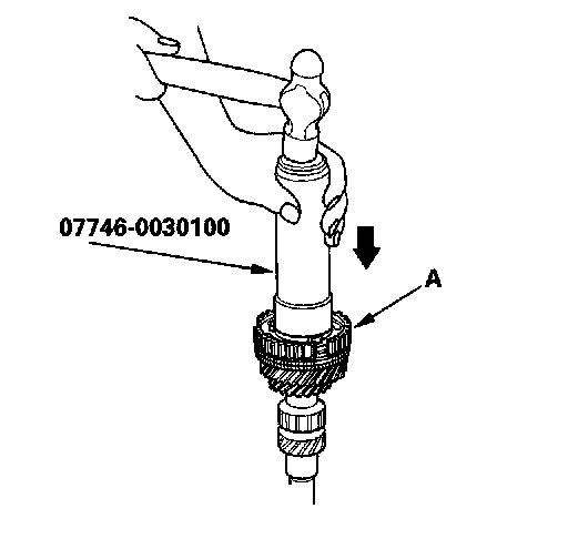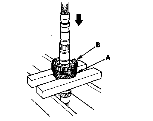 3. Support the 3rd gear (A) on steel blocks, and press the mainshaft out of the 3rd/4th synchro hub (B). Use of a jaw-type puller can damage the gear teeth.