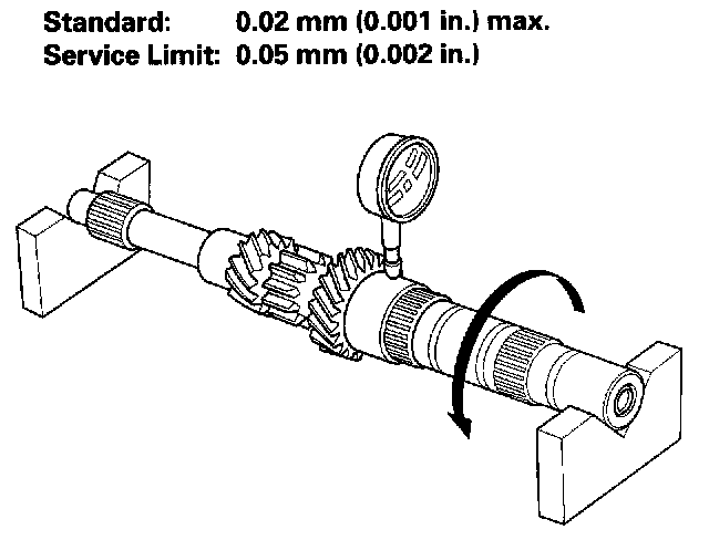 2. Inspect the runout by supporting both ends of the mainshaft. Rotate the mainshaft two complete revolutions when measuring the runout. If the runout is more than the service limit, replace the mainshaft with a new one.