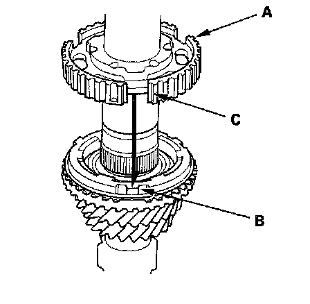 12. Install the 5th/6th synchro hub (A) by aligning the synchro cone fingers (B) with the grooves in 5th/6th synchro hub (C).