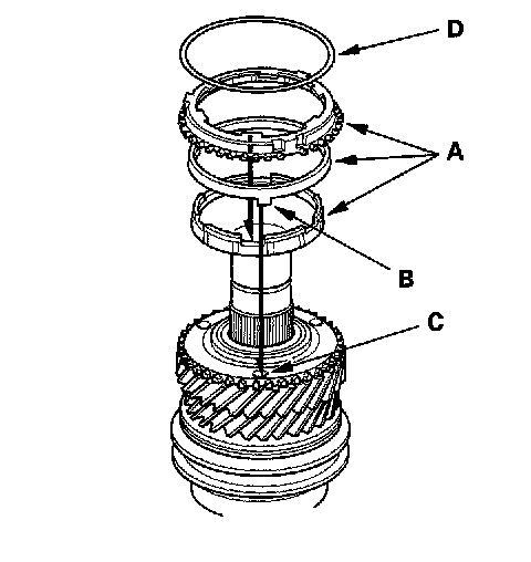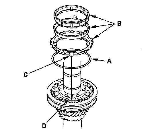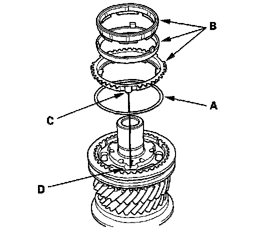 3. Install the double cone synchro assembly (A) by aligning the synchro cone fingers (B) with the holes in 3rd gear (C), then install the synchro spring (D).