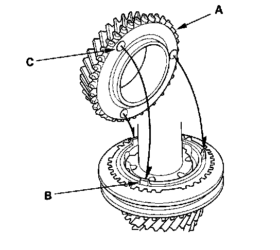 4. Install the 3rd/4th synchro hub (A) by aligning the synchro cone fingers (B) with the grooves in 3rd/4th synchro hub (C).