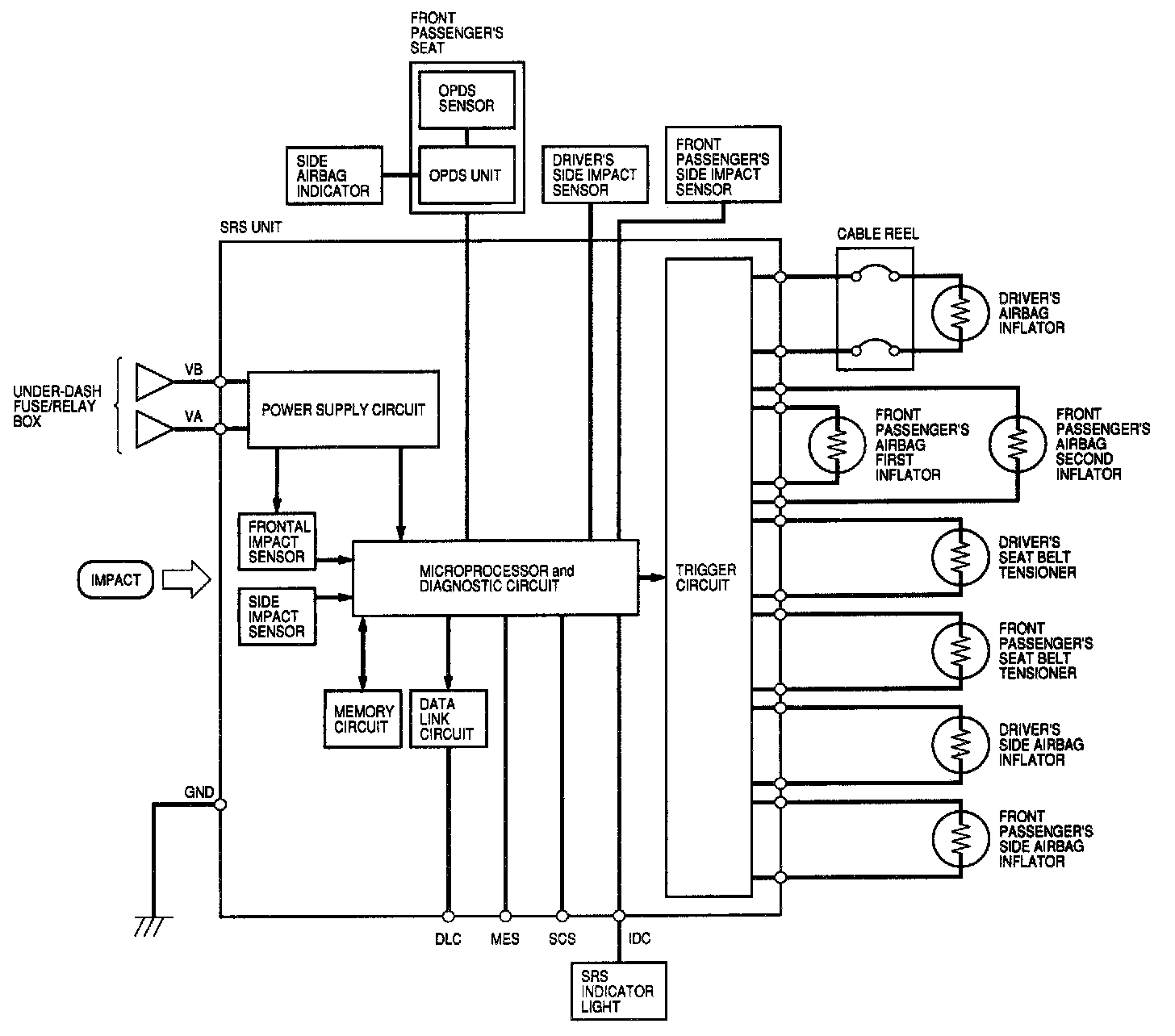 The main circuit in the SRS unit senses and judges the force of impact and, if necessary, ignites the inflator charges. If battery voltage is too low or power is disconnected due to the impact, the voltage regulator and the back-up power circuit respectively will keep voltage at a constant level.