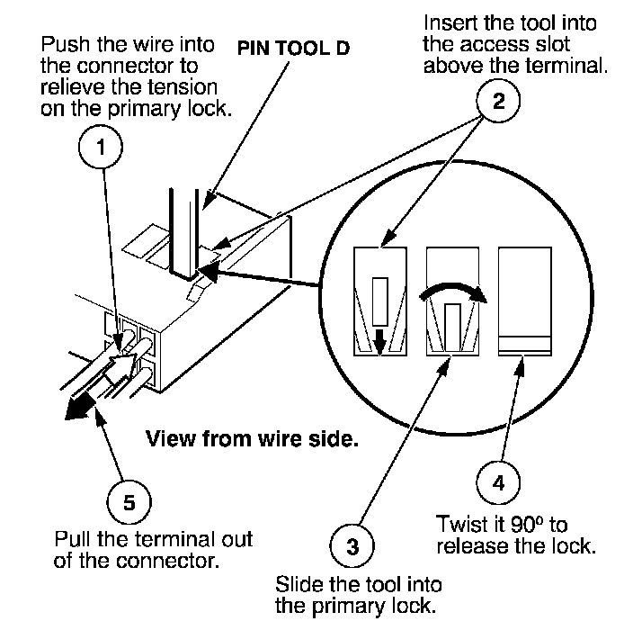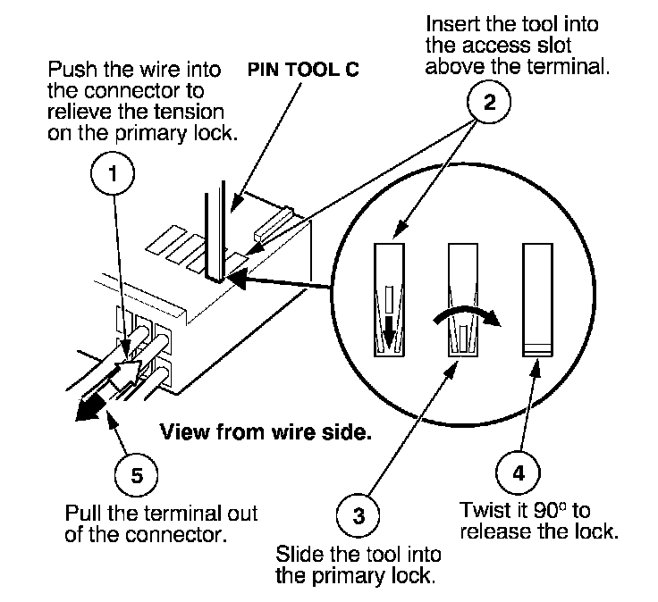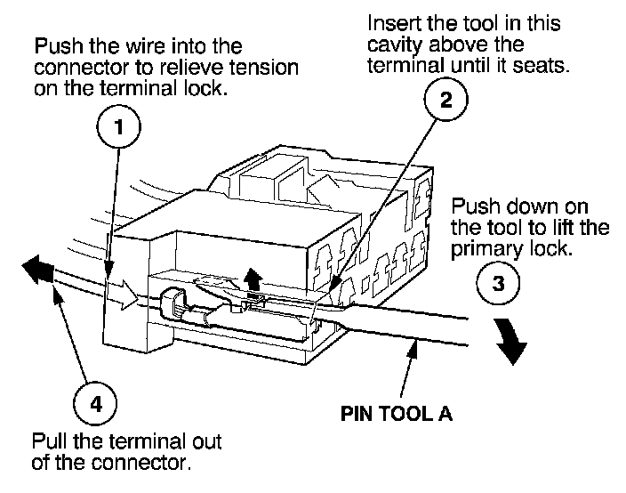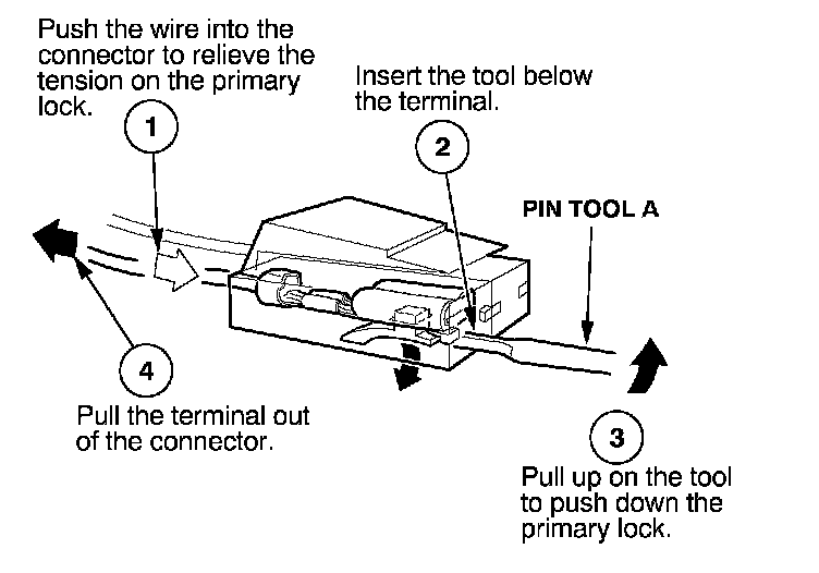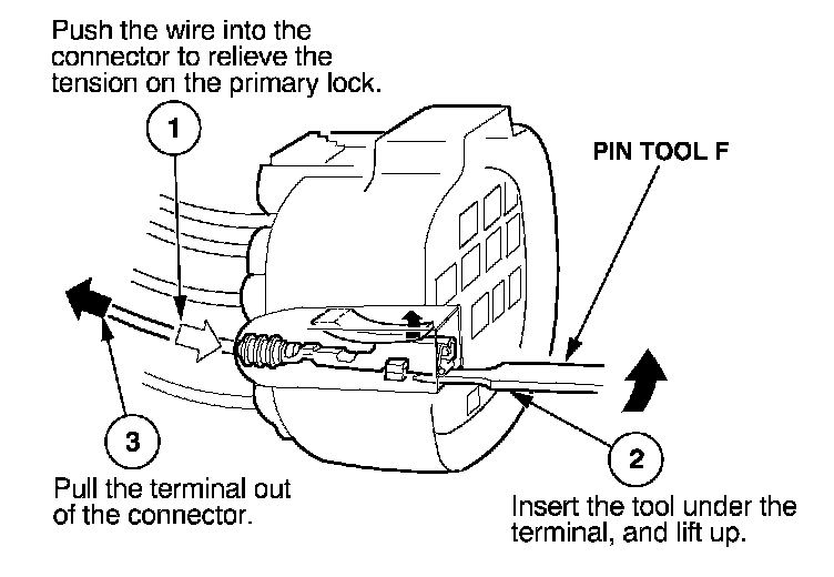 Before you begin, inspect the wire you are about to repair for damage and length. Make sure the wire will be long enough to make a terminal repair without stretching it when you reinstall the terminal in the connector. If the wire is too short, or if access to the connector is too restricted to make a terminal repair, you may need to install a pigtail terminal (a short length of wire with a factory-crimped terminal on it). Refer to HOW TO INSTALL PIGTAIL TERMINALS.