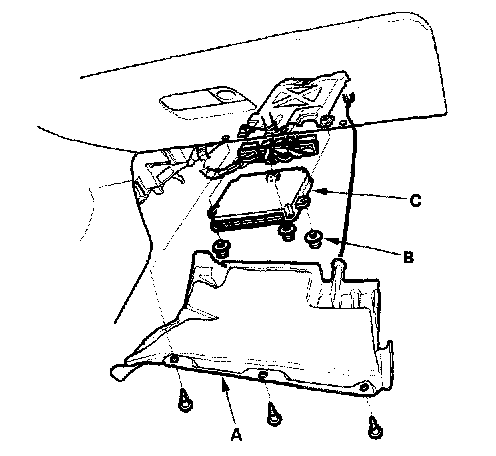 3. Remove the ECM/PCM mounting bolts (B) and the ECM/PCM (C).