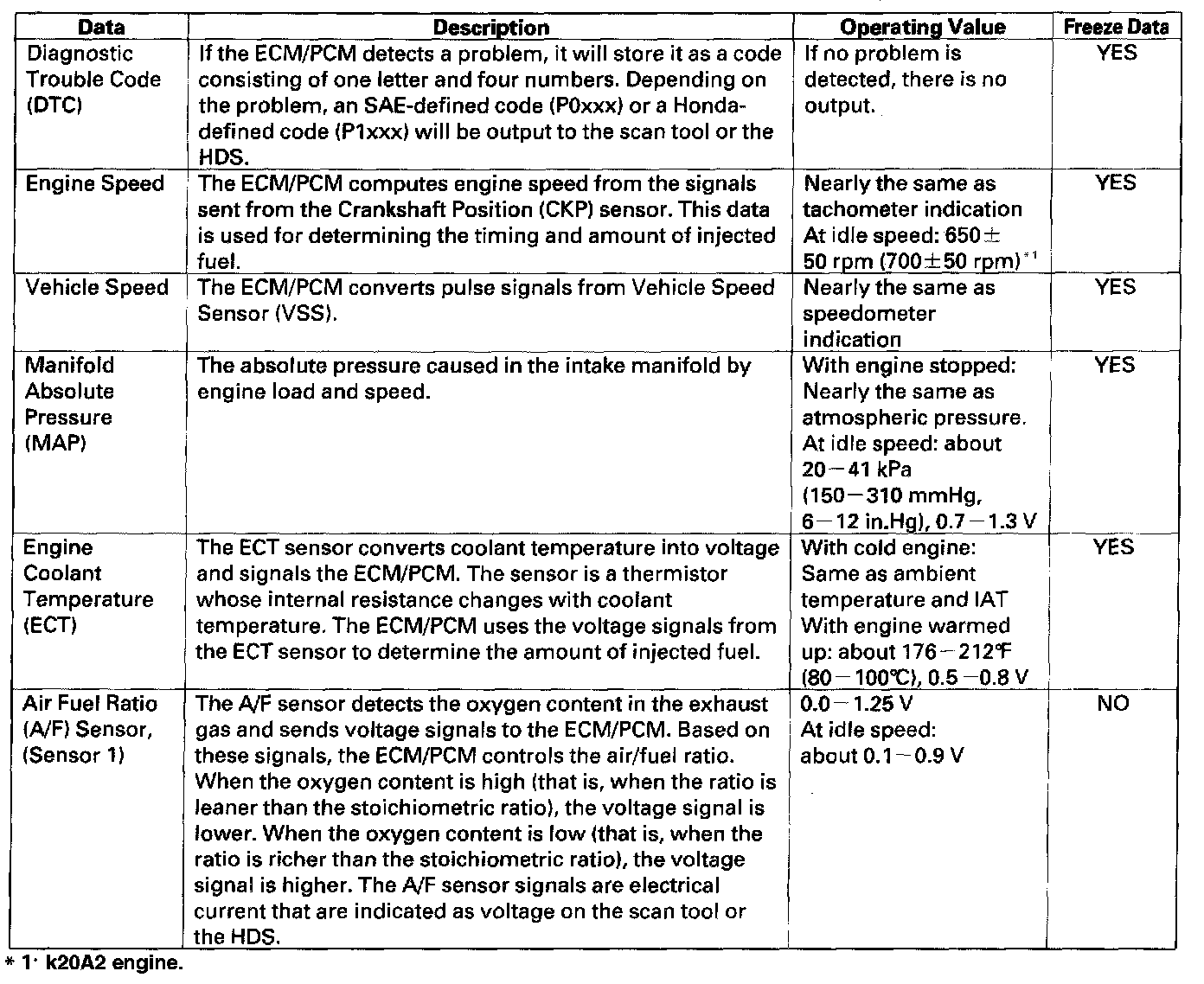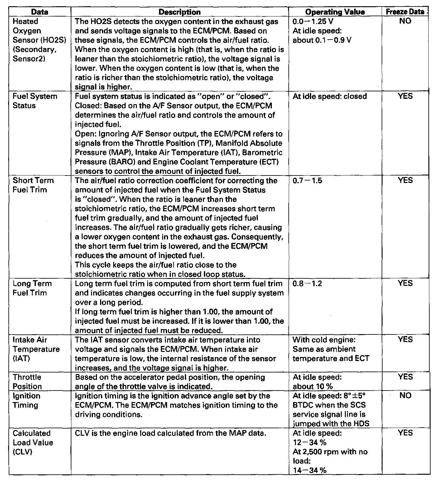 ECM/PCM DataYou can retrieve data from the ECM/PCM by connecting the scan tool or the HDS to the Data Link Connector (DLC). The items listed in the table conform to SAE recommended practice. The HDS also reads data beyond that recommended by SAE to help you find the causes of intermittent problems.