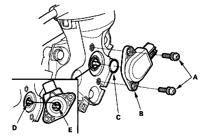 2. Install the sensor with a new 0-ring (C), and make sure the projection (D) inside the IMRC valve matches up with the groove (E) in the sensor.