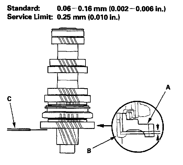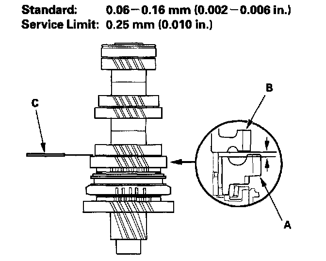 4. Measure the clearance between the 2nd gear (A) and 3rd gear (B) with a feeler gauge (C). If the clearance is more than the service limit, go to step