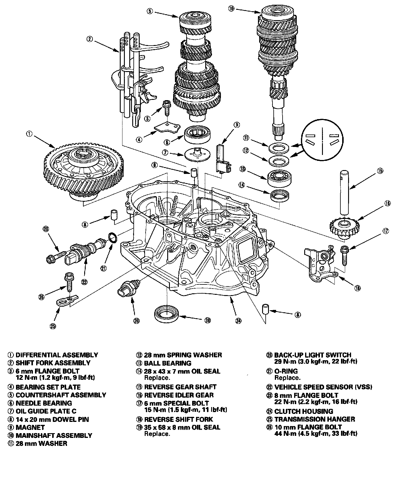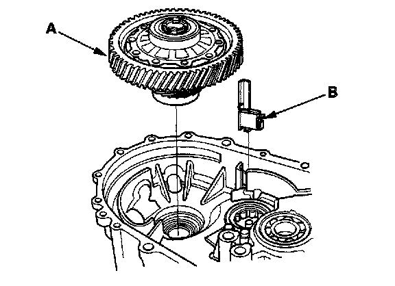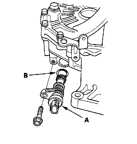 2. Remove the Vehicle Speed Sensor (VSS) (A) and O-ring (B).
