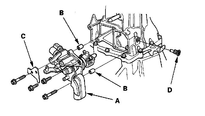 3. Remove the shift lever assembly (A), 8 x 14 mm dowel pins (B), clutch line clip bracket (C), and interlock bolt (D).