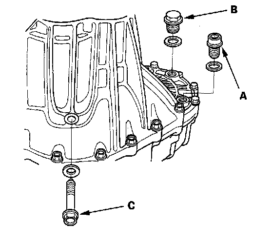 4. Remove the drain plug (A), filler plug (B), and 10 mm flange bolt (C).