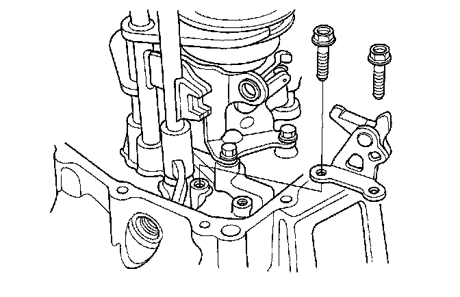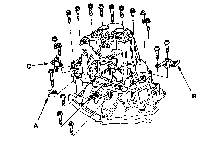 6. Remove the harness bracket (A) (6-speed model only), the transmission hanger A (B), and the transmission hanger B (C).