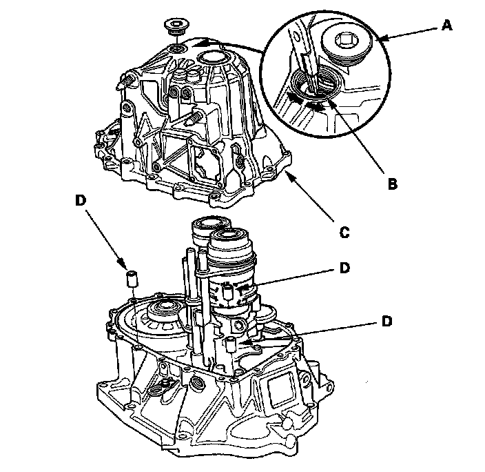 9. Remove the transmission housing (C) and 14 x 20 mm dowel pins (D).