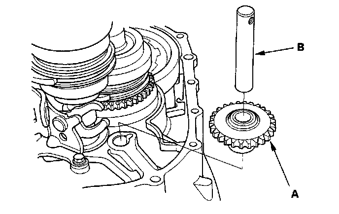 11. Remove the reverse idler gear (A) and reverse gear shaft (B).