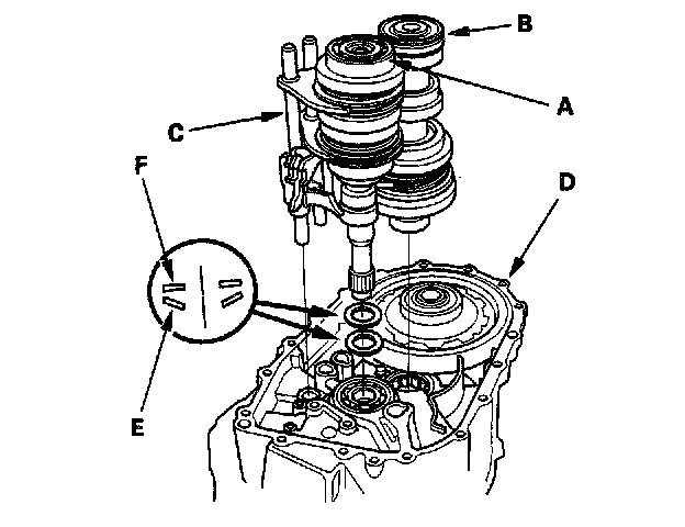 13. Apply tape to the mainshaft splines to protect the seal, then remove the mainshaft assembly (A) and countershaft assembly (B) with the shift forks (C) from the clutch housing (D).