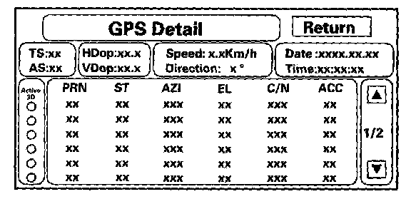 By pressing and holding the MENU button for 10 seconds, a GPS Detail screen is displayed. This screen displays real time incoming satellite positional data when the vehicle is outside in the open. The information shown on this screen is for factory use.