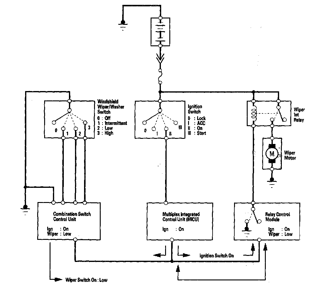 Messages are transmitted by an ECU (that monitors an input) over the communication circuit. ECUs that use the message (information related to that input) are the receivers. For example, the combination switch control unit monitors the wiper switch. When the wiper switch is placed in the low speed position, the combination switch control unit transmits that message on the communication circuit. The relay control module receives the message and turns on the wipers by providing a ground for the relay.