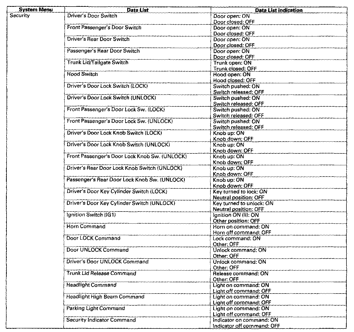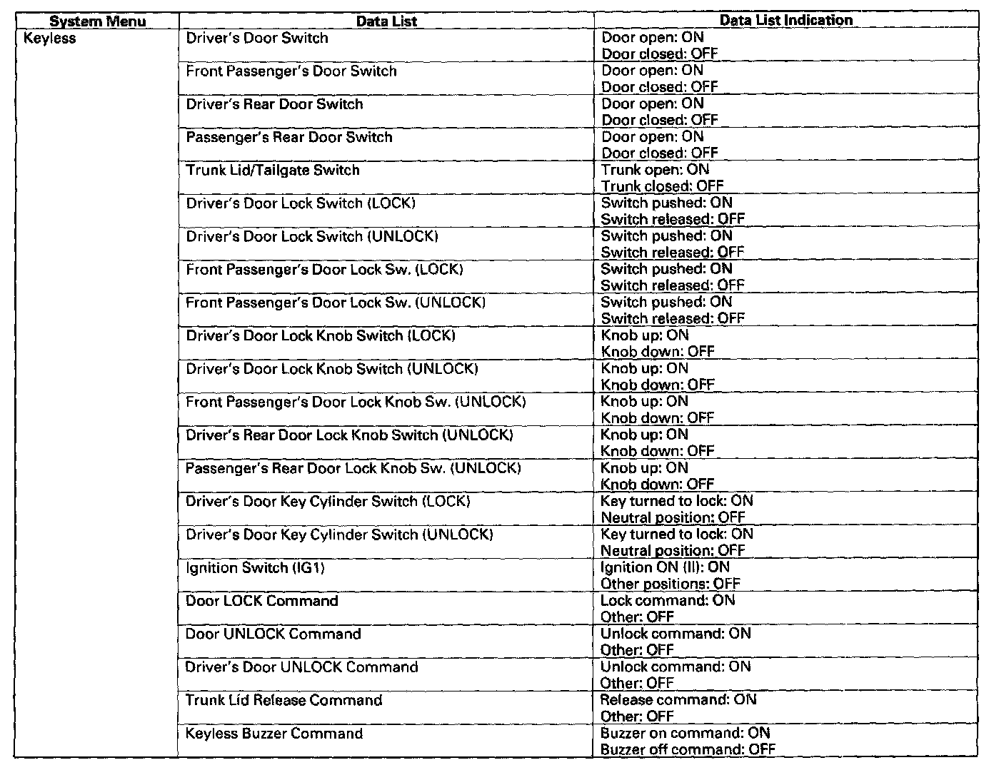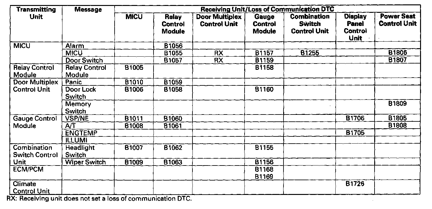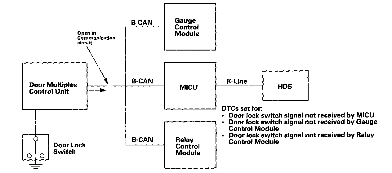 Since there is a break in the communication circuit, the door lock switch signal could not be received by the gauge control module, multiplex integrated control unit (MICU), or the relay control module Each of these units will set "loss of communication" error codes for the signal(s) they did not receive There may be multiple communication DTCs if the unit that has become disconnected from the network would normally transmit multiple messages during the communication line test For example, the door multiplex control unit sends the keyless panic signal and door lock switch signal during the communication circuit test