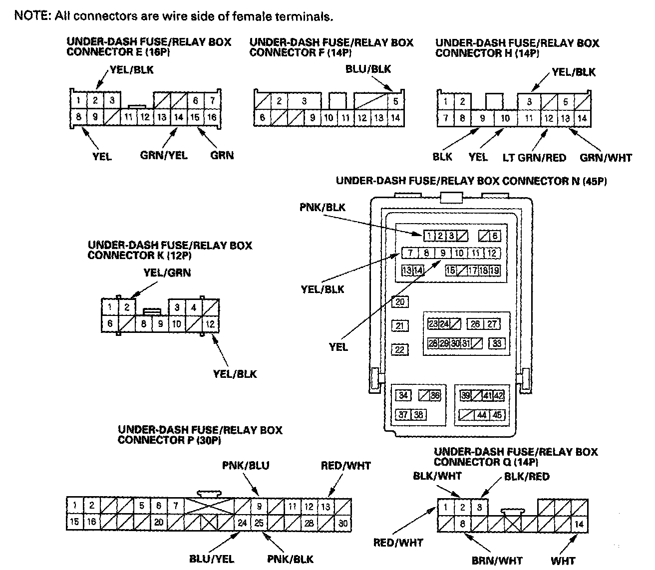 6. Reconnect all connectors to the under-dash fuse/relay box. Turn the ignition switch ON (II), and make these input tests at the appropriate connectors on the under-dash fuse/relay box.